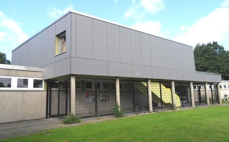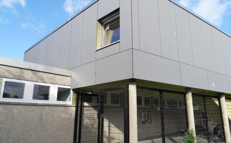 Im Zuge der Umbaumaßnahme wurde das Obergeschoss komplett energetisch ertüchtigt und mit einer neuen Plattenfassade und Fensteranlagen modernisiert.