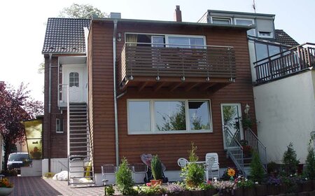Zweigeschossiger Anbau an eine Doppelhaushälfte, als komplette Holzkonstruktion und mit Holzfassade.